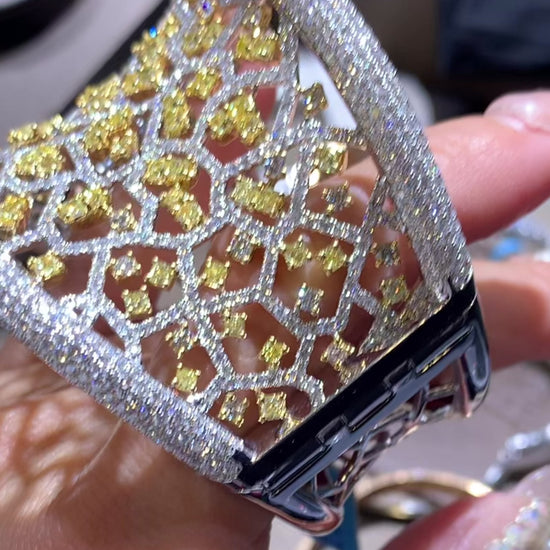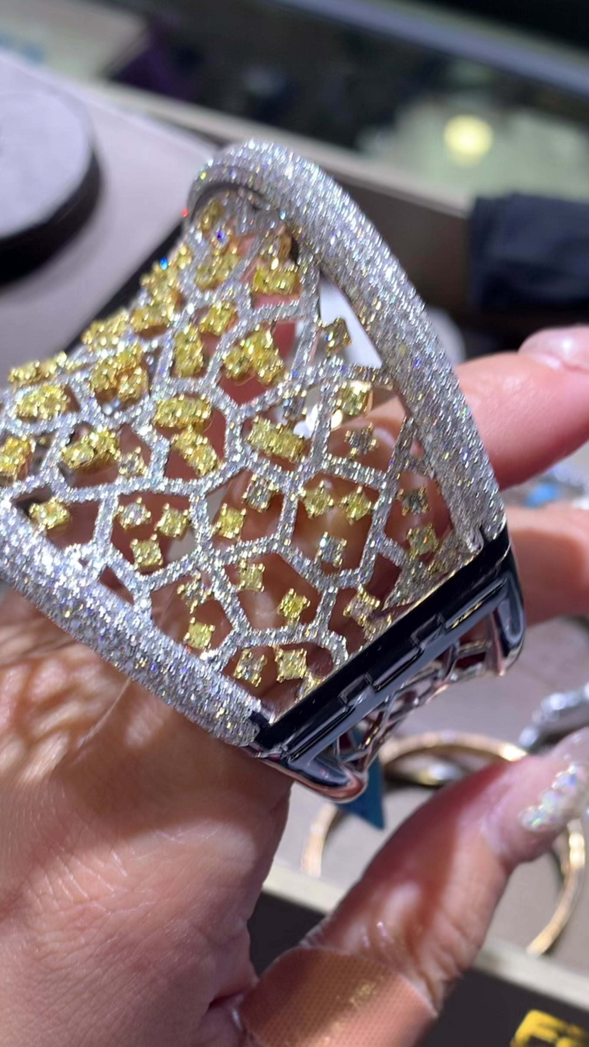 Handcrafted in 90.8 grams of 18K White Gold, it features 1,062 natural diamonds (11.8 ctw) paired with 64 fancy yellow natural diamonds (4.83 ctw) — a truly one-of-a-kind creation.