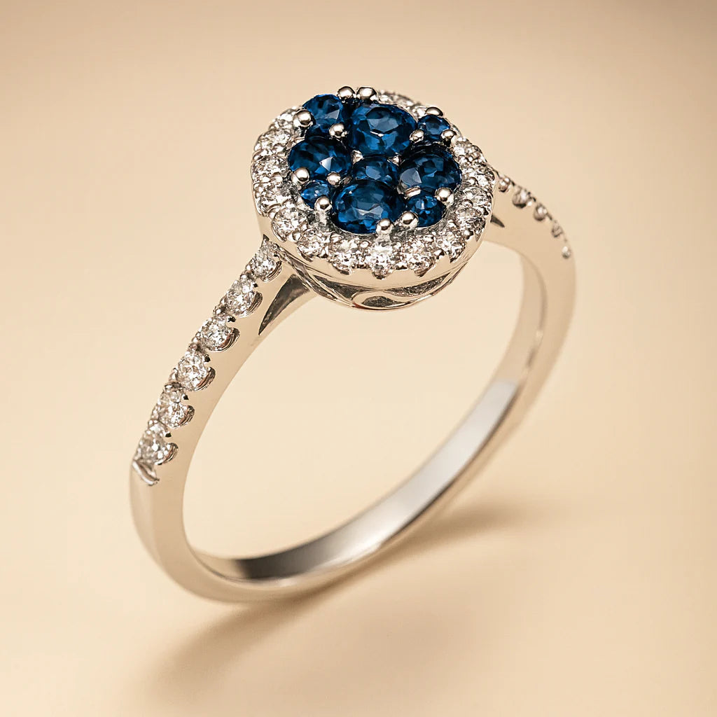 Meet Diana — a masterpiece in 18K white gold that captures elegance in every angle. At its heart, nine deep blue sapphires (totaling 0.43 carat) are set in a clustered floral pattern, encircled by thirty-four sparkling round-cut diamonds (0.32 carat). The luminous diamonds create a halo effect, amplifying the rich, velvety tone of the sapphires.