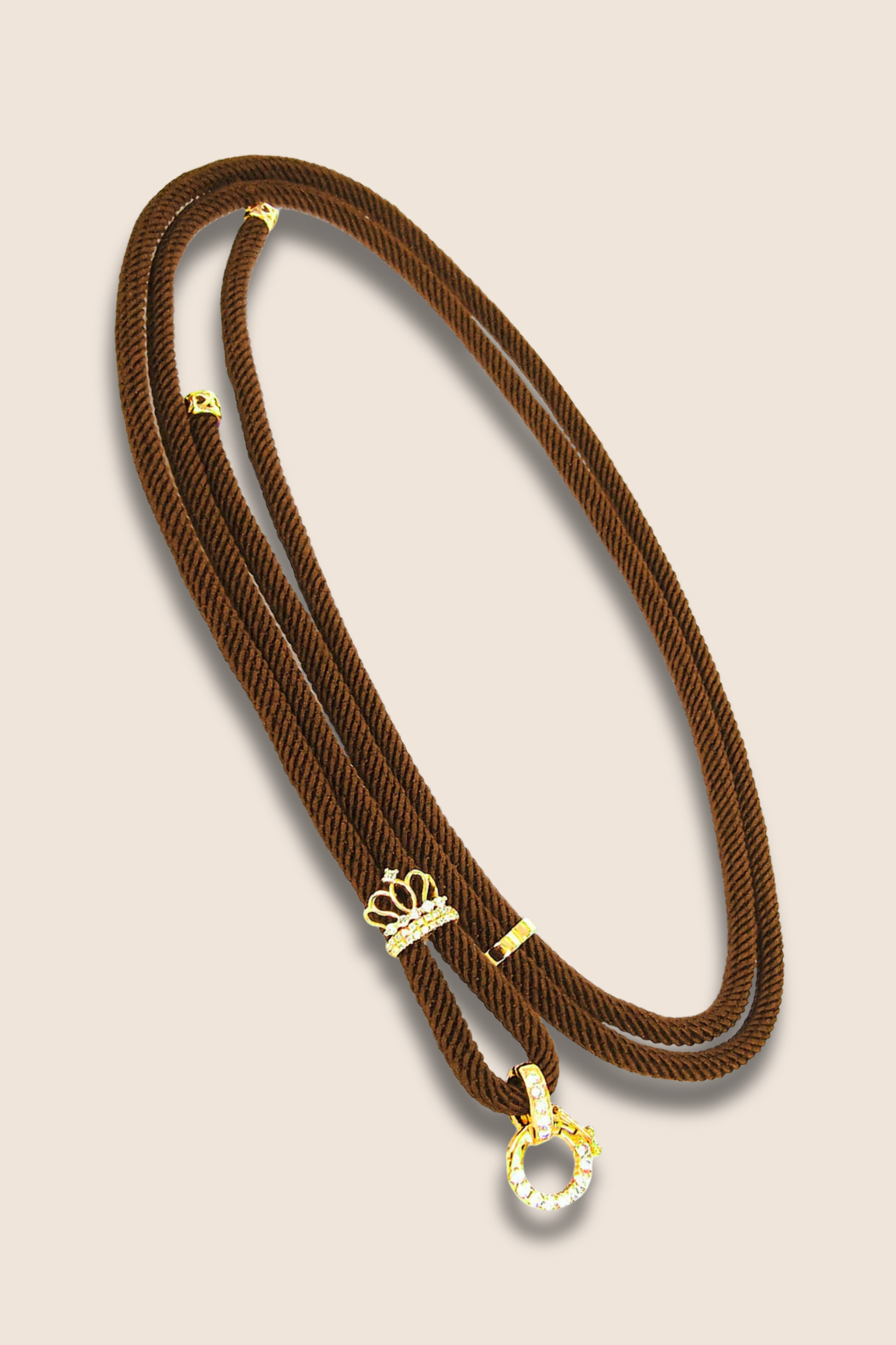 Imagine Eloise draped gracefully against a silk blouse or framing the neckline of an evening gown. The warm, chocolate-brown cord offers a contemporary twist to the timeless beauty of gold and diamonds, creating a sophisticated contrast that turns heads without trying. Ideal for a yacht-side brunch, an art gallery opening, or a black-tie dinner, this necklace balances everyday wearability with heirloom charm.