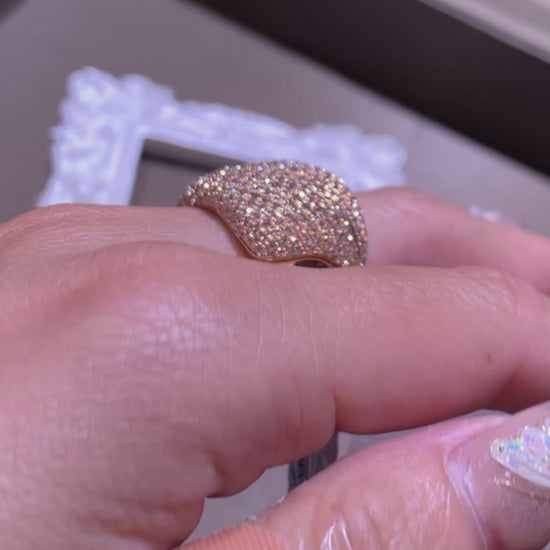A bold sculptural dome in pure gold, cloaked in a sweeping field of natural diamonds with a sleek central fold detail. Striking volume meets seamless brilliance.