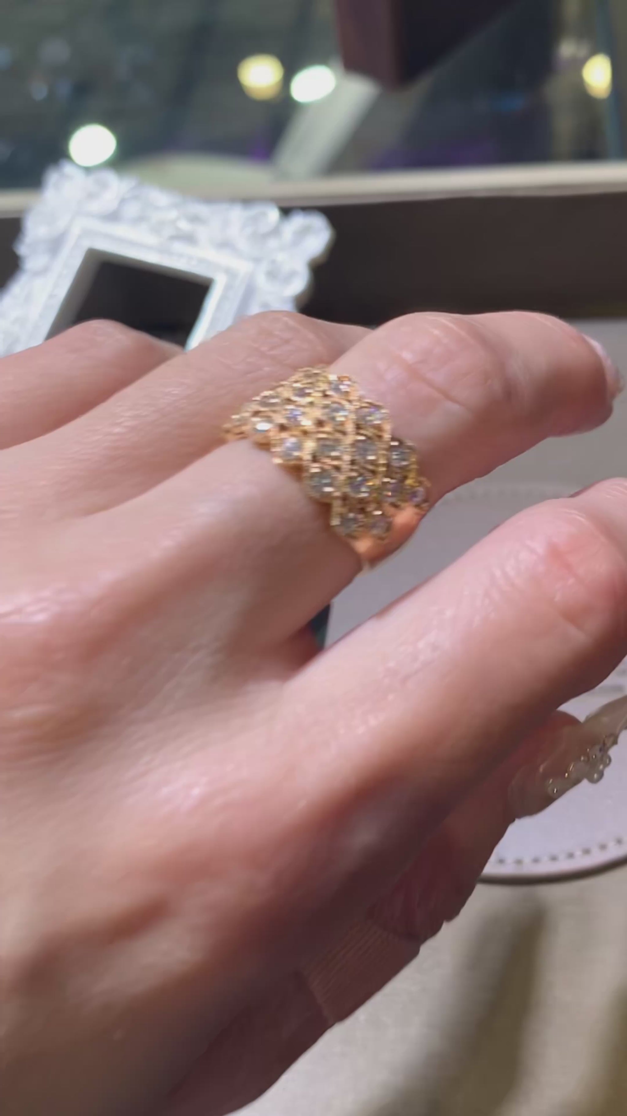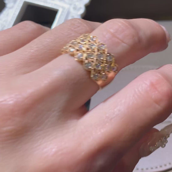 The Raveena Lattice Ring is a masterpiece of geometry and light, where golden symmetry meets diamond fire. Each natural diamond is framed in a delicate marquise-shaped bezel, forming a quilt-like lattice that ripples with brilliance across the finger. The scalloped silhouette softens the structure, adding a touch of femininity to its regal precision.