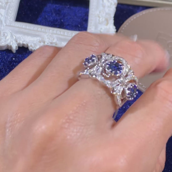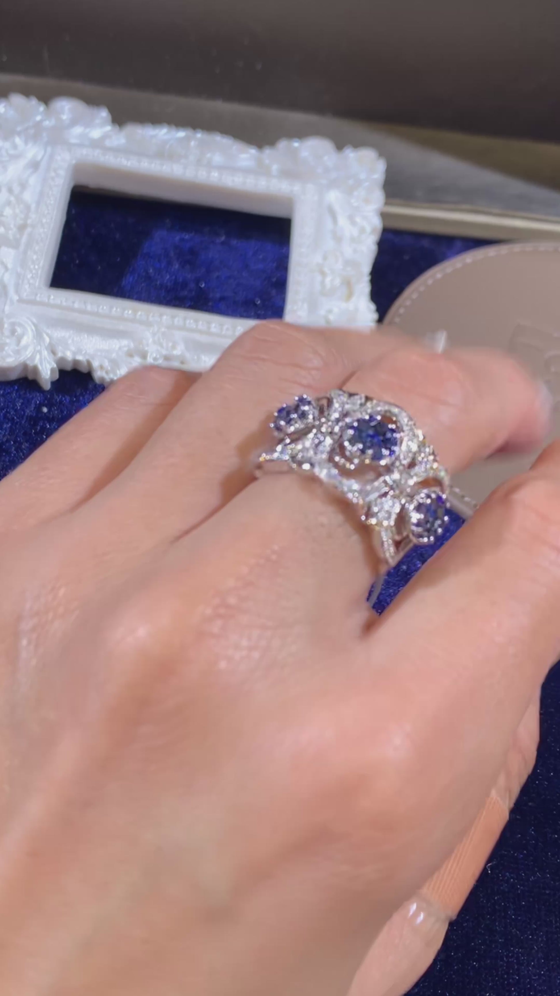 Let it anchor a navy silk blouse or a little black dress; add simple diamond studs and let the cobalt clusters do the talking. A striking right-hand piece and a chic September-birthstone gift.