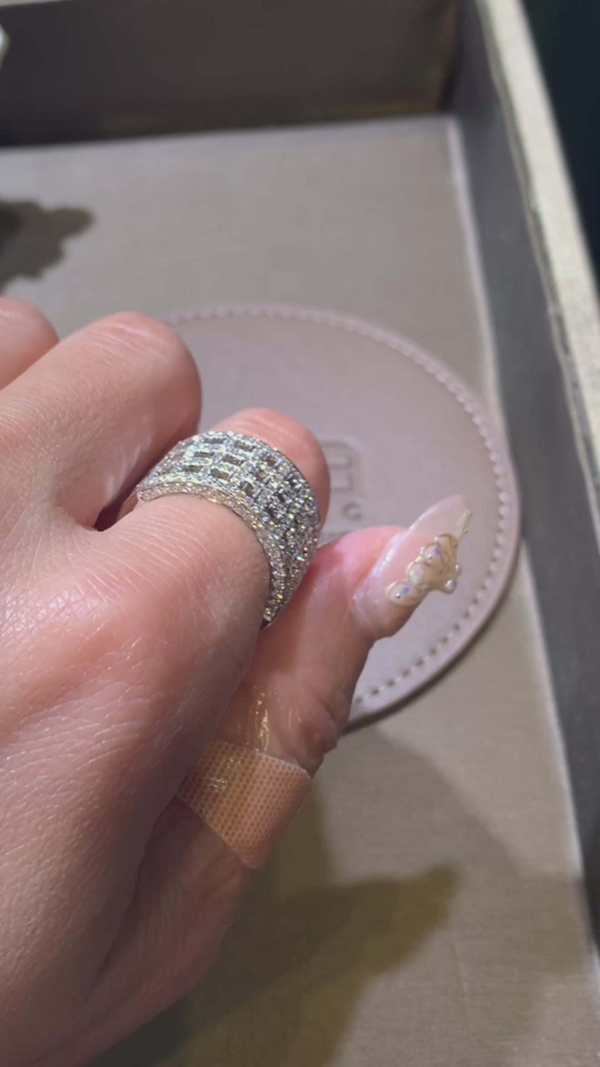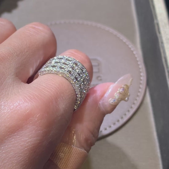 A wide, architectural ring in gleaming white metal, pierced with a grid of open “skylight” windows. The upper arc is fully pavé-set, with diamonds framing each aperture and tracing the edges for seamless sparkle—bold structure meets airy negative space.