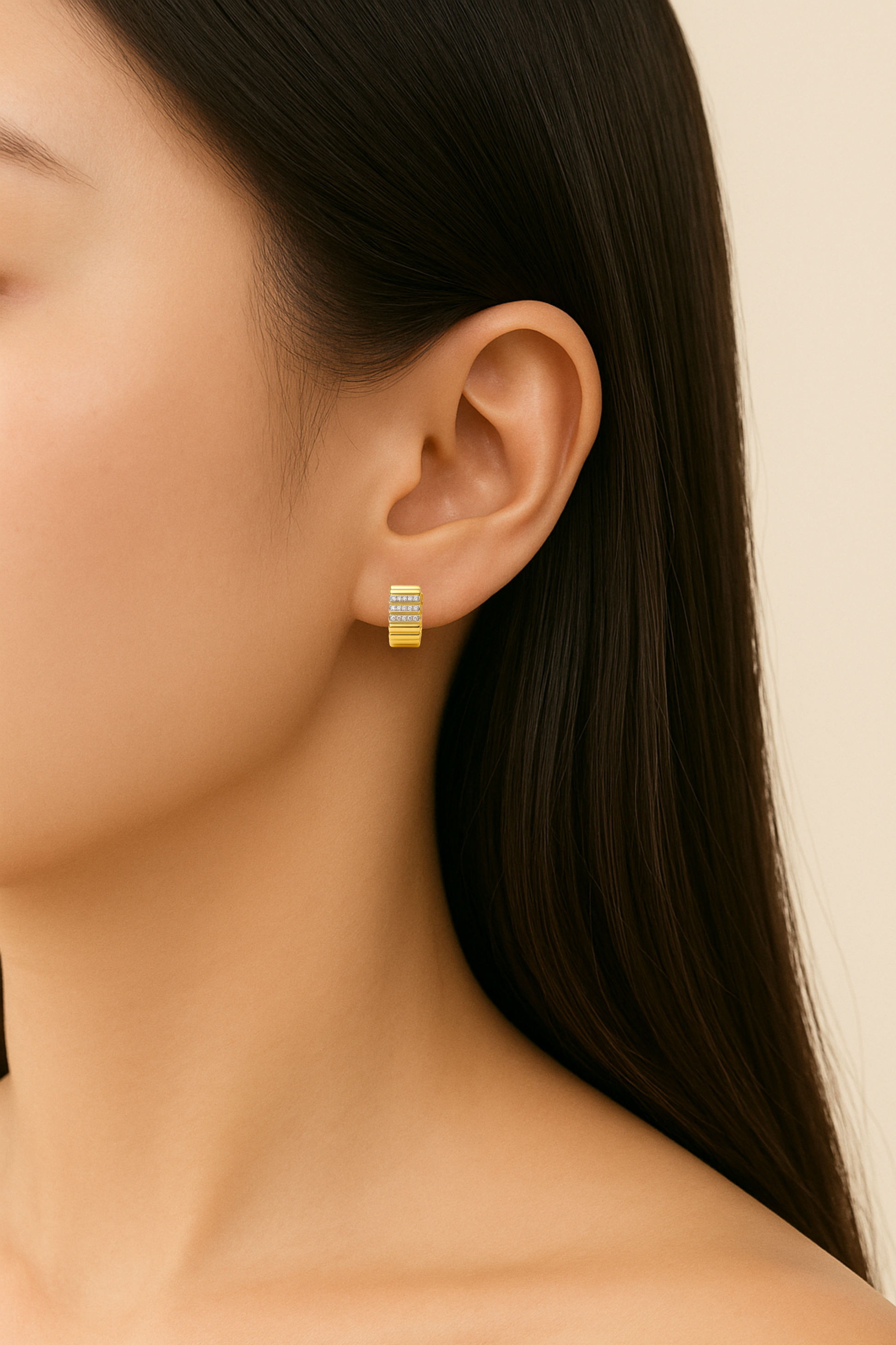 Bold yet refined, the Venetia huggies feature a striking straight-ribbed gold design accented by four pavé-set diamond bars on each earring. Crafted from 14K solid gold, these earrings are adorned with 48 high-quality white diamonds totaling approximately 1.0 carat. The brilliance of white diamonds, a symbol of strength, love, and health, is perfectly paired with the warm luster of gold, evoking success, fortune, and generosity. Measuring approximately 10–12 mm, they offer the perfect size for everyday luxury or special occasion sparkle.